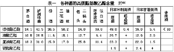 日本产的烧酒在原酒中三大高级脂肪酸乙酯含量和我国白酒大体相仿,经贮存过滤后的成品酒含量大为降低。在老姆酒等其它蒸馏酒中含量也少,唯独我国这三大高级脂肪酸乙酯含量较多,这是在香气成分上的又一特征。(见表一)