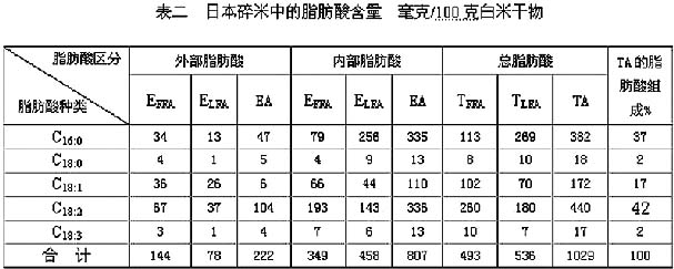 原料米中的脂质是甘油基等非极性脂质约占76%及磷脂质的极性脂质约占24%的比例所构成,这些脂肪酸的种类是含碳16~18个的高级脂肪酸,其含量见表二。
