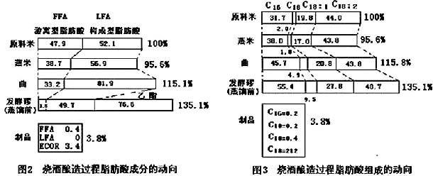 游离型的脂肪酸(FFA)在酿造全工序中都逐渐减少,在蒸馏时一部分蒸入制品酒中。