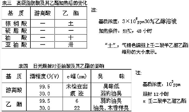 这三种脂肪酸乙酯中,除棕榈酸乙酯为饱和脂肪酸乙酯外,其余二种都属于不饱和脂肪酸乙酯,尤其亚油酸乙酯更为活泼而不稳定。近年来,在日本随着经济状态的变化,消费者希望买到更多的高档烧酒,以前一向就地生产,销售的烧酒随着流通机能停留的时间变长,作为制品的高级化需要延长贮存期使酒质熟成。流通过程时间长就要求品质稳定。恰好随着市场需要的这种变化出现了烧酒有“油臭”异味的质量问题。经过各种试验研究证明,油臭生产的根源在于亚油酸乙酯,它在贮存过程中氧化分解成壬二酸半 醛 乙 酯 (Ethyl azelate semialdehyde)并伴随有微量的正己醛、2,4一香堇叶醛、庚而酸半乙醛乙酯,这些都为油臭物质。油臭的产生和酒精度成反比;贮存液面比率大,日光,加热,以及在低酒度时延长贮存期都能促进亚油酸乙酯的分解作用,使成品酒质量低劣。这些条件对我们低度优质白酒的生产工艺是值得注意的,如若处理不当就会影响到风味质量,兹分别列图表说明如下。