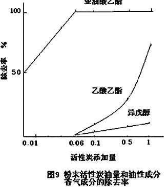2.吸着法 西谷等人曾选用聚乙烯醇(聚合度 200)、氧化硅(200~300目)、活性矾土(酸性)、粉末纤维素(200目)、聚酰胺(TLC用)、马铃薯蛋白、粉末滑石、合成吸附剂(孔径90°A)、粉末活性炭(A、B、C三种)等各种吸附剂进行试验,结果以活性炭最好。在油性成分完全溶解状态(酒精度60%V)活性炭的添加量和油性成分及香气成分吸着率关系如图9所示,对于烧酒加活性炭0.05%,亚油酸乙脂即可完全除去,而香气成分乙酸乙脂和已戊醇几乎不被除去。