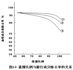 3.再蒸馏法 调制酒精分为25%V,分别含棕榈酸乙脂、油酸乙脂、亚油酸乙脂200ppm的试料在烧瓶中间接加热进行再蒸馏。其蒸馏比例和油性成分的去除率%见图10。