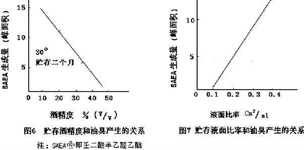 从图6可知,当酒精度超过35度,由于亚油酸乙酯的溶解度增加较大(见图一),它在我国的高酒精度(60°左右)白酒中能很好地溶解而不产生胶状沉淀,因此并不分解成壬二酸半乙醛乙酯的油臭物质。相反,近年来有的白酒厂采用固体发酵的优质酒尾直接勾兑优质酒精,充分利用酒尾中乳酸乙酯及部分高级脂肪酸乙酯等香气成分,所制成的液态法白酒作为大路货产品,其风味质量较好,值得效仿。所以对于产品风味质量,需要根据不同情况,科学地分别对待才能正确地采取必要的技术措施。