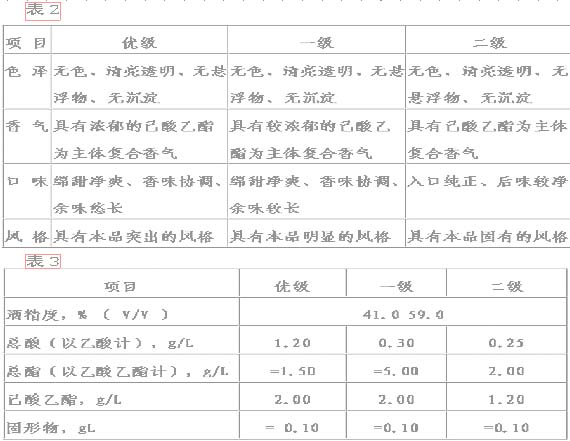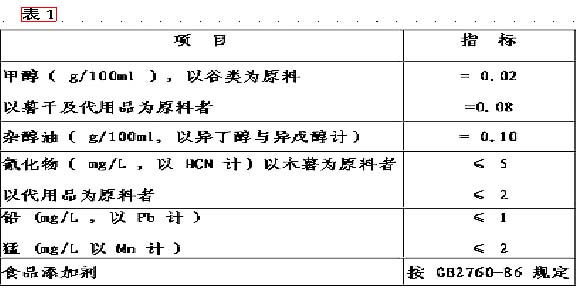 透明无色液体(配制酒可有色),无沉淀杂质,无异臭异味。(见表1)