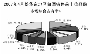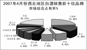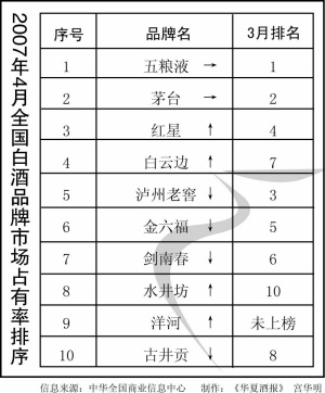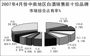 根据中华全国文章来源华夏酒报商业信息中心统计,2007年4月份,全国重点大型零售企业白酒零售量为1969.23千升,同比增长16.28%。本月市场前十位品牌的市场综合占有率合计为57.10%,相比上月下降了3.47个百分点。
