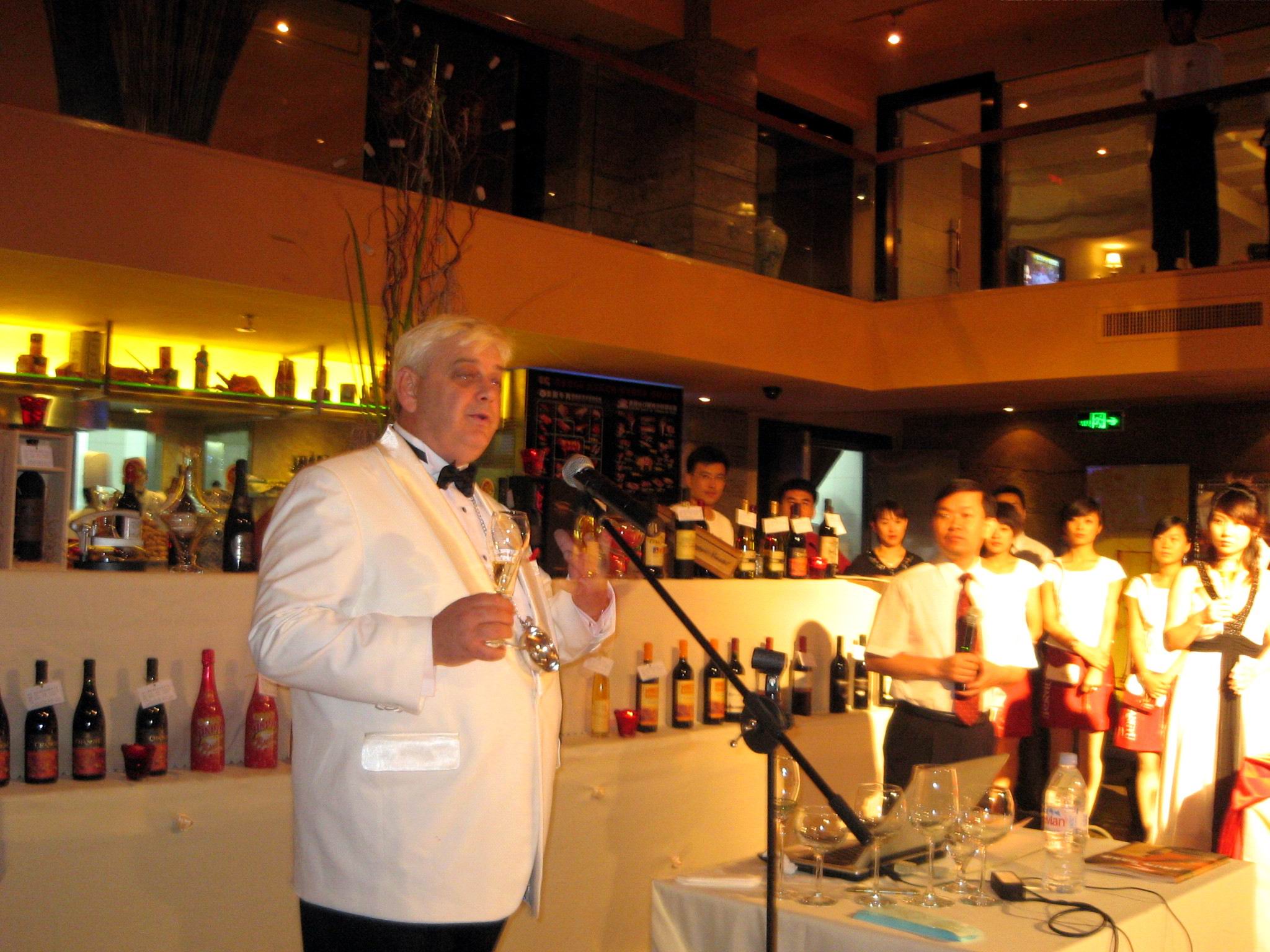 图为张裕公司首席品酒师克瑞斯向广大红酒爱好者讲解葡萄酒品评知识。
