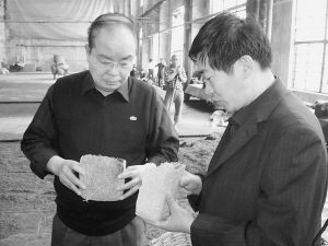 近日,中国酿酒工业协会白酒专家组组长梁邦昌来到河南省张弓酒业有限公司,对公司的生产情况进行了调研,并对公司员工进行了培训。图为梁邦昌对张弓的曲块情况向张弓酒业副总经理孙西玉进行了解。