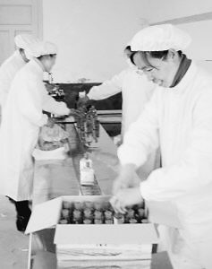 福建省泰宁县朱口镇龙湖村农民黄东明利用当地茶叶资源优势,从安徽一所大学购得茶酒生产专利,在家乡投资100多万元,建起“三创”茶酒厂,不仅吸收了农村富余劳动力,还为茶叶的销售开辟了新渠道。这是该厂投资生产的第一批茶酒走下生产线,工人们正忙于包装。