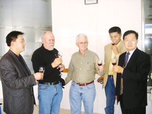 4月23日,由《华夏酒报》牵线,美国EBC制桶公司总裁RonnieRobinson(中)、美国TALON酒庄首席酿酒师JohnPitcock(左二)和青岛安信国际贸易有限公文章来源华夏酒报司总经理谢向东(右二)到方圆集团烟台金鼎葡萄酒公司洽谈合作事宜。图为该公司总工程师徐滋恒(右一)和客人在实验室品酒。