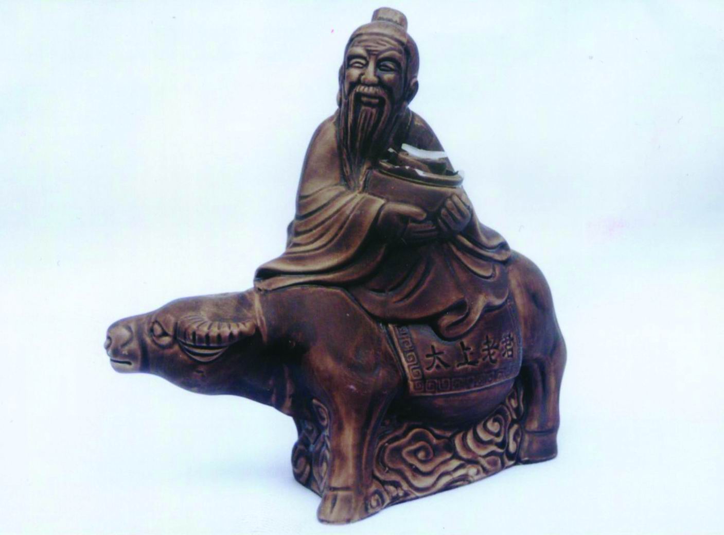 我的邻居是河南人,他知道我的收藏爱好,特地从家乡河南带来了太上老君酒瓶送我。酒瓶材质为灰色紫砂泥,雕塑着一头肥硕青牛,牛背上坐着慈目善面的老子,他双目远视,长须飘逸,身着道袍,双手捧着酒坛,酒坛已经开启,仿佛是边喝着酒,边欣赏着沿途美景,显得悠哉悠哉!此瓶造型独特,线条细腻流畅,人物传情,不仅是一件实用酒器,也是一件精美的雕塑品!