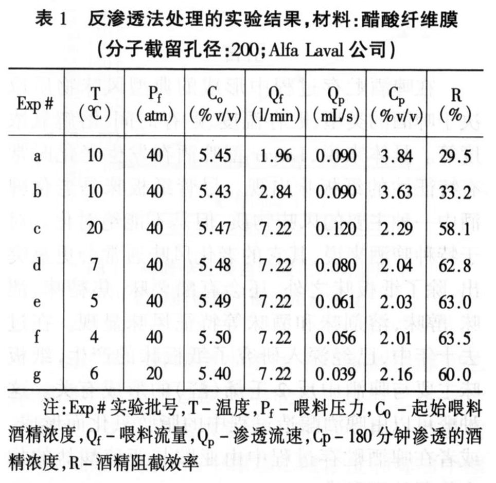 有几种膜可被用来进行啤酒的脱醇操作,包括由醋酸纤维制备的半渗透文章来源华夏酒报膜(参数:DSS-CA995P,分子量截留孔径200;Alfa Labal公司);由聚酰胺制备的半渗透膜(参数:BWRLC,BW30LE和SW30HR,Centec公司);由玻璃纤维支撑的聚酰胺半渗透膜(参数:ACM4和ACM2,Centec公司)。由于良好的渗透性能和较小的乙醇阻截性,Alfa Lava公司的产品被最后选用。