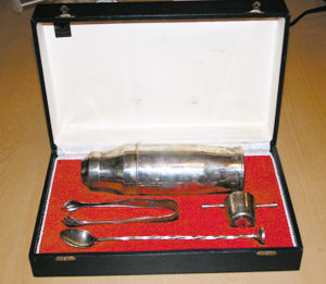 作者收藏的一套银质调制鸡尾酒的专用工具。盒子里面有鸡尾酒壶、冰爪、量杯和长把勺,器形非常美观别致。