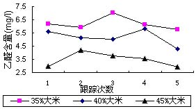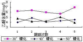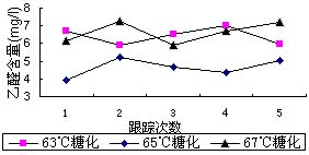 从图3可看出:65℃糖化有利于降低成品酒乙醛含量。就跟踪检测数据而言,65℃糖化较63℃糖化或67℃糖化,其成品乙醛含量下降幅度约为20%。