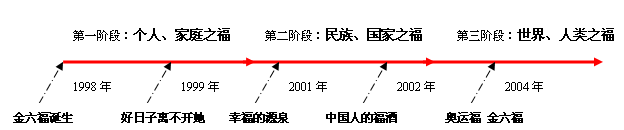 金六福的更高明之处在于,它将“福”文化作为一种不断成长的文化。实际上,细细琢磨金六福这个名字,其实已经隐含了这一点:金六福、今六福,当然要把握今天、结合时代、与时俱进。于是,金六福将个人之福、家庭之福,提升到民族之福、国家之福,并进而延展为人类之福、世界之福,在这三级跳跃中,不断演绎和丰满金六福的品牌形象。