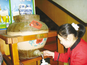 为淄博中小型酒店的“新宠”。厂家为了更好地销售自己的产品,特别为指定酒店配送了酒具。图为淄博文姜酒店的服务人员正在为客人盛佰世堂42度陈年老坛酒。