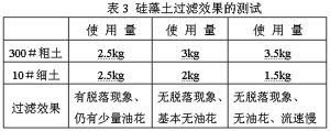 2.2 新配制的酒中,当酯类物质含量大于其溶解度时,多余的酯类会析出,飘浮在酒面上形成油花。原先采用的粗硅藻土是3000#,细硅藻土是300#,由于过滤密度不够,再加上这种硅藻土易脱落,因此过滤机不能有效地将油花滤住。现在采用300#硅藻土为粗土,10#硅藻土为细土,这样过滤密度增加的同时,硅藻土的粘度也得到增加。粘度附着力的增强,可防止硅藻土脱落,过滤效果得到加强,对油花就不会漏滤。(详见表3)