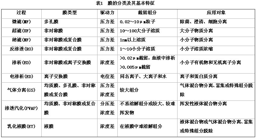 膜就结构分为对称膜、非对称膜及复合膜;依据其孔径的不同(或称为截留分子量),可将膜分为微滤膜、超滤膜、纳滤膜和反渗透膜;根据材料的不同,可分为无机膜和有机膜。目前,已开发应用的膜分离技术主要有:微滤、超滤、纳滤、反渗透、电渗析、气体分离等见表1。