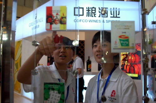 长城葡萄酒"城市奥运酒标设计大赛"征集的作品在中粮酒业长城葡萄酒展区展出