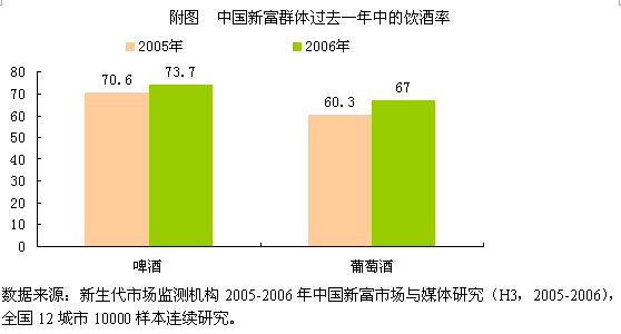 从(新富定义是高消费、高学历、高收入的“三高”人群)中,葡萄酒的饮用率却是仅次于啤酒的,而且,中国新富对葡萄酒的饮用量与啤酒的饮用量差距不大,且增长速度明显。
