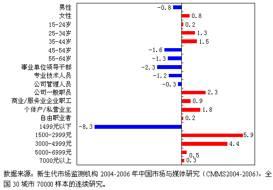 而从新生代市场监测机构最近3年的研究数据对比发现,2004年-2006年,女性、25-44岁的中年人、公司一般职员、个体户/私营业主、商业服务业企业员工、个人月收入在1500-4999元的中低收入群体饮用葡萄酒的比例增加明显。