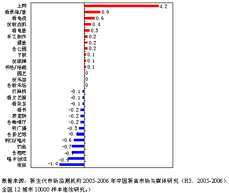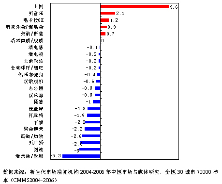在中国新富群体中,上网的比例增长明显,看录像、电视、玩游戏机、看电影等屏幕前的娱乐休闲比例都有所增加。户外休闲娱乐有所减少。