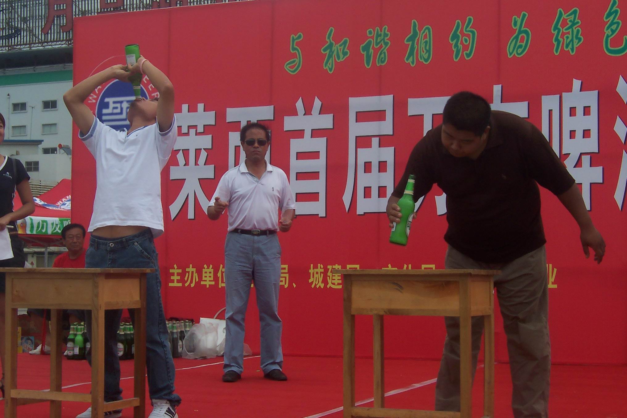 山东莱西首届万友啤酒文化节期间举行了盛大的饮酒大赛,“速饮王”评比、夫妻喝酒大赛、奶瓶喝啤酒,以新颖的形式吸引人们的目光。
