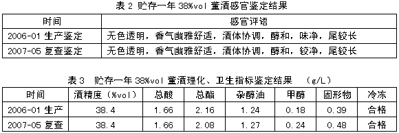 3.2.1贮存一年同一批次的38%vol董酒进行感官指标、理化、卫生指标鉴定,生产出厂时的感官指标、理化、卫生指标与现在复查结果对比见表2、表3。