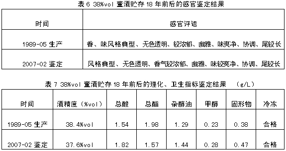 4.2.3 从28%vol、38%vol董酒多年变化的理化、卫生指标鉴定情况看,总酸、杂醇油、甲醇、固形物比原来有所增加,酒精度、总酯比原来有所下降。28%vol酒经过13年的贮存,38%vol酒经过18年的贮存后,其理化、卫生指标值都在标准范围以内,符合标准要求。