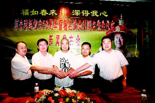 为了进一步提升自己的品牌影响力, 近日,浮来春集团特聘著名演员张国立作为主打品牌“浮来春”的形象代言人。张国立在新闻发布会上表示,他被“浮来春”深厚的文章来源华夏酒报文化内涵和该公司董事长武玉杰的为人所打动,所以欣然接受为“浮来春”代言。据了解,在合约期间,“浮来春”将是张国立代言的唯一酒类品牌。 图为8月6日,新闻发布会现场。