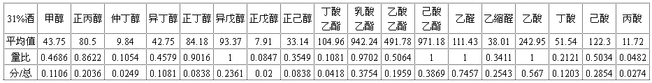 31%voL扳倒井酒低度白酒色谱骨架成分见下表(单位:mg/l)。