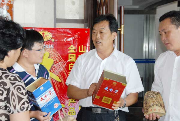 山东颐阳酒业粮食酒公司总经理王胜明(右二)向经销商介绍文登学窖藏新品。