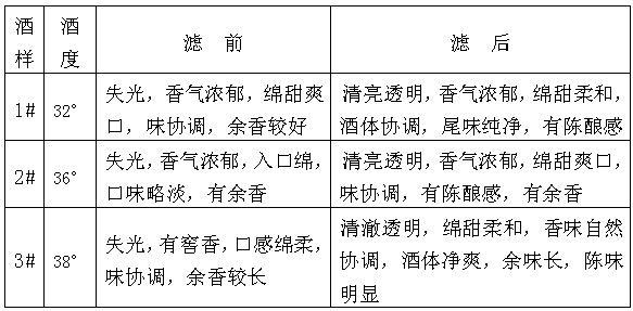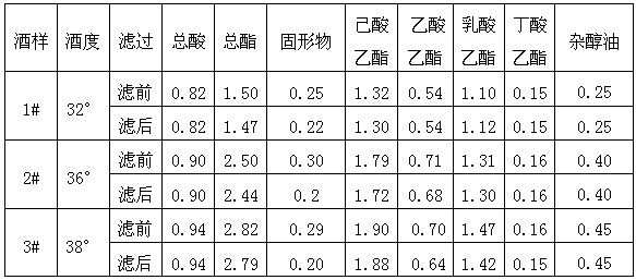 通过试验检测数据对比可以看出,过滤前后理化检测指标变化不大,香味成分损失不明显,固形物含量降低,口感质量有较大提升。