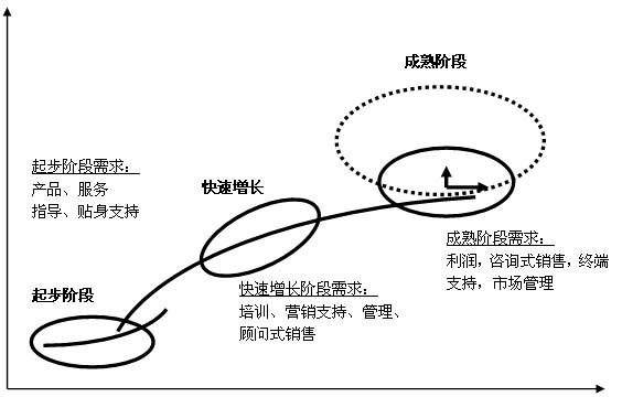 1.起步阶段:经销商最大的需求是厂家的指导和贴身支持,需要厂家告知他们如何开发新市场、新网点,如何制定新产品上市计划,如何制定促销方案及策略等等。