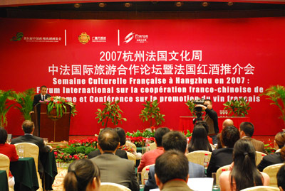 继“天都之梦”大型文艺晚会、纯正法国葡萄种苗的移栽天都城、法国风情油画展开幕、中法音乐舞蹈交流会、法国乔治碧茜和马迪埃城市日、中法航空飞行交流暨飞越天都表演等系列浓郁法兰西风情活动的陆续开展,10月30日下午,拥有法式浪漫情怀的天都城又迎来一场代表了真正法国文化精髓的活动——中法旅游合作国际论坛暨法国红酒推介会,法国巴黎红酒协会、法国卢瓦尔白葡萄酒企业共同为杭州市民带来了纯正的法国红酒推介会和法国红酒文化宣传表演。同时,来自法国巴黎红酒协会的全球最佳品酒师PIANETTI Pierre Alain还亲自演示了如何真正学会品鉴法国红酒。