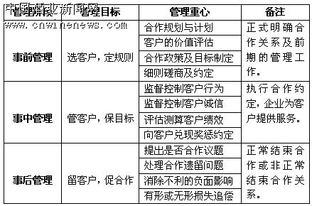 下面从事前(合作开始前)、事中(合作中)、事后(后续合作)三个阶段方向性地来谈一谈如何行使客户关系管理职能化(见表1)。