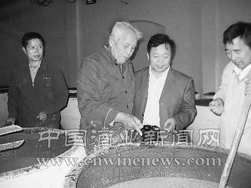 图为王阿牛(左二)在会稽山生产现场传授绍兴黄酒酿造技艺,左三为公司总经理傅祖康。
