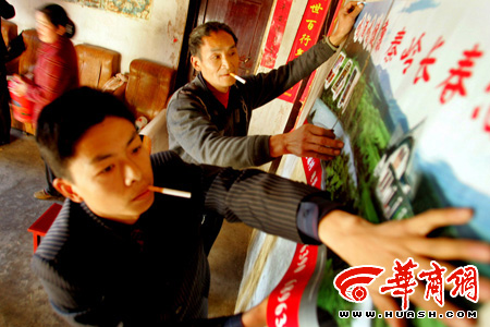 下午4时,安康宁陕县一酒厂工作人员带来4箱酒慰问周正龙。未落座,酒厂来人张贴宣传画,周正龙帮忙。