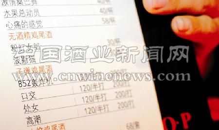 酒吧里放着刺耳的音乐,灯光有些昏暗迷离。记者一行三人坐下后拿起桌上的酒水单,上面的酒水名字看了让人有点 “脸红心跳”。上面写着“子弹鸡尾酒:口交(120元/半打)、处女(120元/半打)、高潮(120元/半打)”。