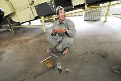 10月8日下午4时30分,下班铃声响过。老李师傅就坐在车间的边上,就着方便面小饮一杯,然后起身回家。他说:“班上紧张,喝一口缓缓气……”
