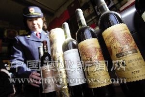 11日,明光村市场一商户涉嫌侵权的400余瓶葡萄酒被海淀工商执法人员暂扣。这种葡萄酒的酒瓶上的长城图形与“长城”干红的长城图形近似,“长城”英文字母写成了“Greetwill”。