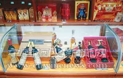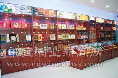 店内用一整列货柜来分档次陈列各类酒水。货柜前摆放了几节柜台,用来陈列各种礼盒酒。