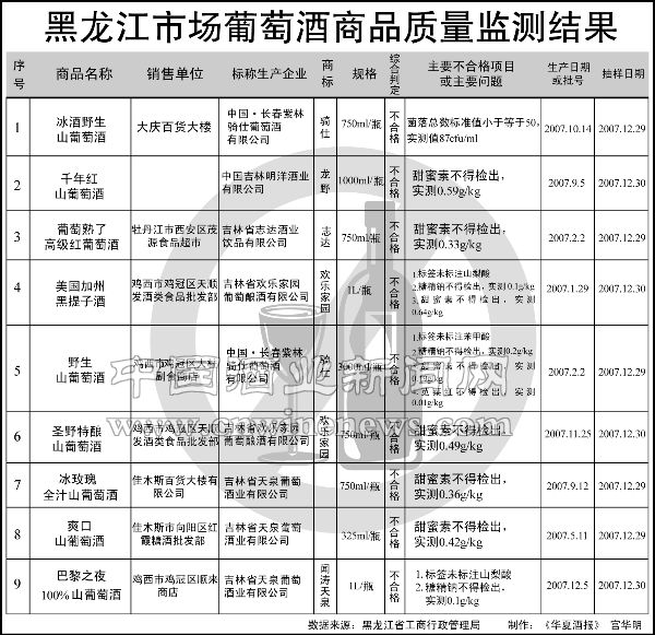 《华夏酒报》记者了解到,黑龙江省工商行政管理局于2007年12月委托国家农业标准化监测与研究中心(黑龙江),对哈尔滨、齐齐哈尔、大庆、鸡西、牡丹江、佳木斯市流通领域的部分葡萄酒进行了抽检。本次抽查依据GB2758-2005《发酵酒卫生标准》、GB2760-1996《食品添加剂使用卫生标准》、GB10344-2005《饮料酒标签标准》等国家标准规定的要求,对葡萄酒的标签、甜蜜素、糖精钠、山梨酸钾、苯甲酸钠、菌落总数、大肠菌群、安赛蜜8个项目进行了检验。