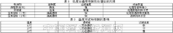 1.淀粉吸附法工艺操作简便,用适量淀粉(0.5—1%)在室温下处理,较好地解决了低度酒混浊问题,不用冷冻设备,有利于降低成本,节约能源,且淀粉资源广泛,价格便宜。