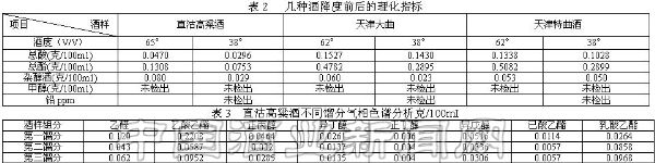 由表13分析结果表明,我们试制的低度白酒38°与张弓大曲38°和德山大曲37°相比,各种芳香成分都很接近。