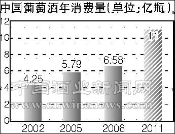 “2006年,中国葡萄酒消费量达到了4.94亿升,相当于6.58亿瓶,相比2005年增长了13.5%,比2002年增长了36%。2005年,中国进入世界十大葡萄酒消费国之列。”Vinexpo海外部主席Dominique HERIARD DUBREUIL根据VINEXPO/IWSR市场研究报告分析,在中国经济强劲的增长背景下,葡萄酒消费的年增长率将从2002年—2006年的7%增长至2006年—2011年的13%。到2011年,中国葡萄酒消费量有望增长到8.28亿升,即中国消费者每年饮用11亿多瓶葡萄酒。