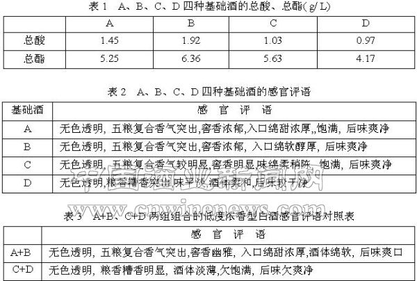在试验中,我们选择质量档次差别较大的四种基础酒A、B、C、D(其总酸、总酯见表1,感官评语见表2)。, 其中由此工艺生产较好的基础酒A、B为一组;,传统工艺生产较差的C、D为一组。将其, 其中 在试验中,我们选择质量档次差别较大的四种基础酒A、B、C、D(其总酸、总酯见表1,感官评语见表2)。 其中,由此工艺生产较好的基础酒A、B为一组;传统工艺生产较差的C、D为一组。将其分别组合两种低度浓香型迎驾贡酒,经过相同的处理后,经本公司评酒委员会(由国家评委、省评委、高级技师、技师等技术人员组成。)评定(见表3)。大家,