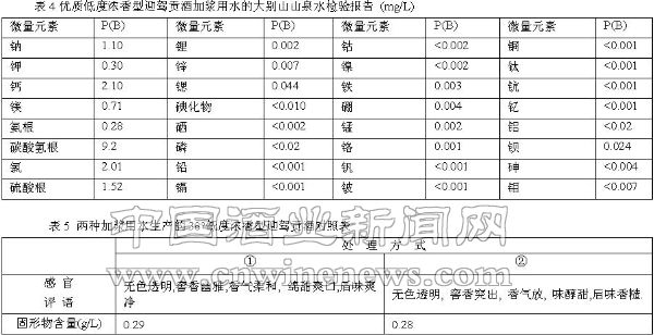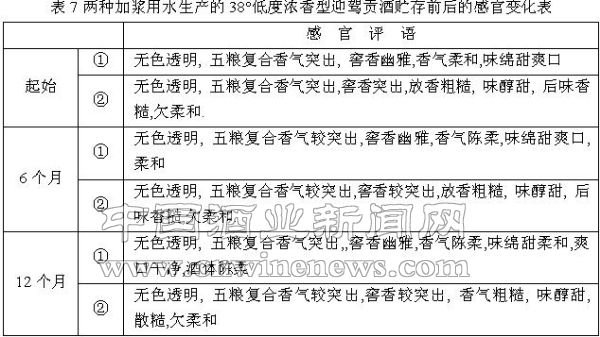 ②经过处理的纯净水。用这两种水作为加浆用水(即降度用水)生产的38°低度浓香型迎驾贡酒,经过多年的实践试验和理化分析、感官评定,发现除固形物有微量差别外,各微量成分并无太明显的区别,但在风格口感方面却有显著不同(见表5) 。