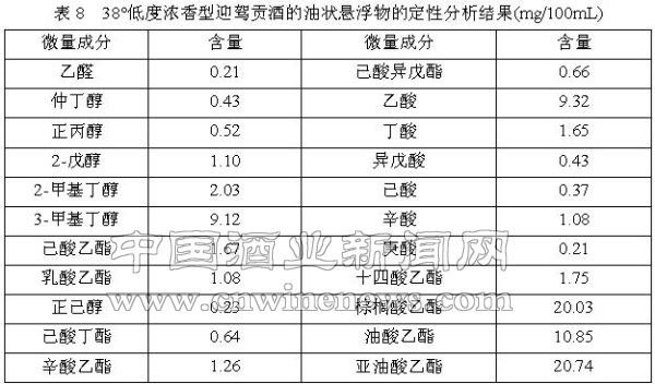 为了进一步剖析低度浓香型白酒失光的原因,本公司对引起低度酒失光的成分采用先进的气相色谱毛细管柱做作了进一步定性分析。对勾兑组合好的未经处理的38°低度浓香型迎驾贡酒进行冷冻处理,直至形成油状悬浮物,然后取油状悬浮物0.1mL溶于500mL60°酒精中,在30-40℃温水中加温30min后,进行毛细管柱气相色谱分析,分析结果见表8。