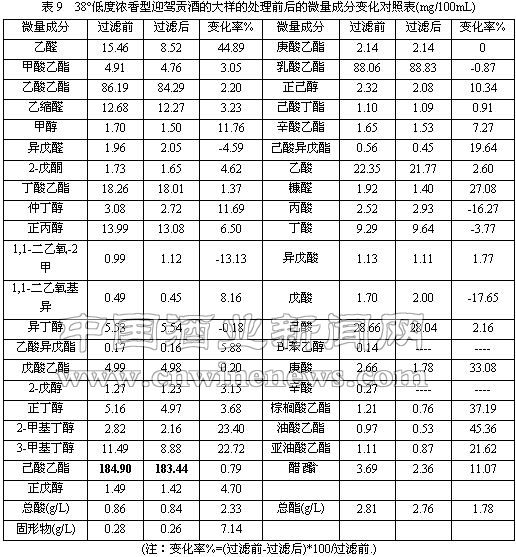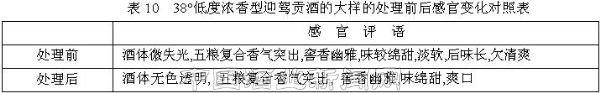 本公司对38°低度浓香型迎驾贡酒大样处理前后的微量成分进行了分析(见表9),其感官变化对照表见表10。