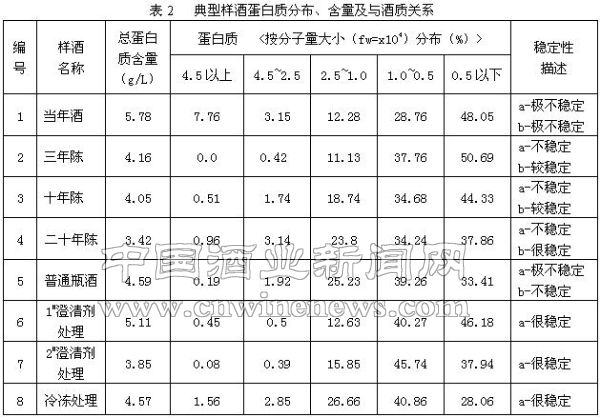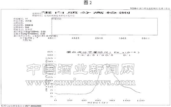 1.黄酒非生物稳定性问题一直困扰着黄酒的生产和流通。大量研究认为,黄酒中蛋白质含量过高是引起黄酒浑浊沉淀的主要原因,在黄酒沉淀中蛋白质的含量一般为30-40%。 近年来,对黄酒沉淀问题的研究报道比较多,但是对黄酒中的蛋白质进行分离,进而研究黄酒中蛋白质分布与黄酒稳定性关系的报道却很少。 朱建航等采用隆丁区分法,研究了高、中、低分子蛋白质与黄酒沉淀的关系。但是,隆丁区分法是利用高分子蛋白质能与单宁沉淀;磷钼酸能同时沉淀高、中分子蛋白质;低分子蛋白质不能被单宁、磷钼酸所沉淀的原理,对酒液分别采用单宁、磷钼酸进行沉淀,然后对原酒及沉淀后的酒液进行凯氏定氮,通过计算得出高、中、低分子蛋白质的含量。因此,该方法不可避免具有以下缺点:(1)测试数据误差大、重复性差;(2)得到的蛋白质按高、中、低分子量分布情况比较粗糙,不能准确地反映黄酒中蛋白质分布的真实情况及含量。 本研究方法以杭州天辰蛋白质分离检测仪为主要仪器,该仪器能对黄酒中的蛋白质按分子量大小进行分离检测,从而得到连续的蛋白质分布图,具有良好的重复性,并能正确反映黄酒中的蛋白质分布及含量,克服了隆丁区分法的不足。因此,我们利用天辰蛋白质分离检测仪对大量绍兴产黄酒中的蛋白质进行了分离检测,研究了黄酒中蛋白质分布、含量及与酒质稳定性的关系,并对提高绍兴黄酒的稳定性提出了建设性意见。 2.材料和方法 2.1 材料 天辰蛋白质分离检测仪;当年花雕酒、陈年花雕酒。 2.2 方法 2.2.1 蛋白质分离检测:样酒采用双层滤纸过滤后,用天辰蛋白质分离检测仪检测。 2.2.2 稳定性试验方法:被测样酒用双层滤纸过滤后,装瓶,70℃30分钟杀菌,然后分别放入6℃冰箱和室内,定时进行观察。这样做主要有两个原因:一是由于未经处理的黄酒放入冰箱极易失光沉淀,而在自然状态下能够观察它们的稳定性;二是经冷冻或澄清剂处理的黄酒在自然状态下稳定性较好,短期内看不出什么变化,而在低温条件下即能发现它们的稳定性差异。两种不同试验方法观察酒稳定性情况见表1。 3.结果与讨论 3.1 结果 3.1.1 一年陈酒典型蛋白质分布图谱(见图1)。 由图1可知,一年陈酒蛋白质分布图谱具有以下特点:(1)在蛋白质分子量10000左右有一个较大的主峰;(2)在分子量约70000左右有一个小峰,这是当年酒与陈年酒蛋白质分布的主要区别所在,因此,该峰是当年酒的一个特征峰。我们检测的所有样品都有此峰,但大小略有不同。 3.在分子量1000左右,有的样酒可检测到一个小峰,有的无法检测到。 3.1.2 陈年(三年以上,包括三年)酒典型蛋白质分布图谱(见图2)。 由图2可知,陈年酒蛋白质分布图谱具有以下特点:(1)在分子量10000左右有一个较大的主峰;(2)分子量大于45000的蛋白质含量极少,70000以上含量几乎为零。我们检测的所有样酒在70000左右都没有峰出现,这是陈年酒的典型特征。 3.在分子量1000左右,有的样酒可检测到一个小峰,有的无法检测到。 3.1.3 典型样酒蛋白质分布、含量及与酒质稳定性研究结果(见表2)。 3.2 讨论 研究证实,所有当年酒都极不稳定,而陈年酒通常处于“b-不稳定”到“b-较稳定”之间。陈年酒明显比当年酒稳定,而且,存放年份越长,酒质越稳定。从蛋白质分布图看,当年酒与陈年酒的主要差别在于当年酒在高分子位置有一个小峰,而陈年酒没有。由此可见,高分子蛋白质的存在会引起黄酒极度不稳定,这与朱建航等人的研究结果是一致的。 表2里1、2、3、4号样酒中蛋白质总量随贮存年份延长而减少,黄酒稳定性似乎随蛋白质总量减少而提高。然而,6、8 号样酒的蛋白质总量明显比1、2、3、4 号样酒高得多,但6、8号样酒的稳定性却比1、2、3、4号样酒好得多。由此,我们是否可以这样认为:黄酒稳定性与蛋白质总量没有直接的因果关系,可能与黄酒中存在的某类特定的蛋白质有关。 从6、7号两只样酒看,由于我们采用澄清剂进行了处理,澄清剂对酒中的此类蛋白质有较好的选择吸附作用。因此,在实验中我们观察到,尽管6、7号样品蛋白质总量比较高,但它们的稳定性却比较好。 8号采用的是冷处理工艺,高、中、低分子蛋白质均有析出,而且5000以下的蛋白质含量比例特别小。由此,我们也能看出引起黄酒冷浑浊的是某类特定的蛋白质,该类蛋白质分子量从高到低皆有分布。而且该类蛋白质中小分子蛋白含量比较多。这可能是因为此类蛋白质最初是一种小分子蛋白,它具有很强的凝聚性,在一定条件下(如低温)发生凝聚反应,形成各种分子量的蛋白质分布于酒中。并且当温度升高时,在低温下凝聚成的大分子蛋白质又会重新分解成小分子蛋白质。 一般黄酒在自然条件下,冬季气温下降,黄酒中的该类蛋白质发生凝聚,分子量不断增大,直到沉淀析出。当气温回升,凝聚成大分子的蛋白质及沉淀物又分解为小分子蛋白质,溶解于酒中。如此不断反复。是否可以这么理解:正因为黄酒中始终有这一类蛋白质存在,从而导致了黄酒在贮存几十年、析出很多沉淀物之后,依然极易产生冷浑浊现象。 鉴于以上分析,我们认为,黄酒稳定性随黄酒中蛋白质含量增大而降低只是一种表面现象。其实质在于,黄酒稳定性可能与酒中的某种特定蛋白质呈正相关。因此,要提高黄酒稳定性,就必须尽量多地除去该种蛋白质。当然,这只是一种猜测,其最终结果有待于实验的验证。但